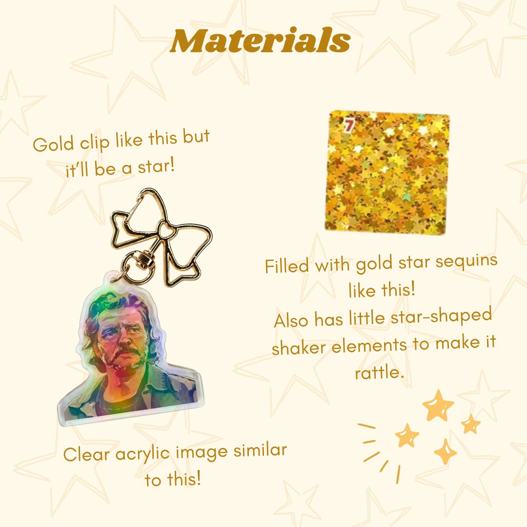 Clear acrylic SHAKER keychains of No Thoughts Cowboy Joel. 2.5" inches and fill with gold star sequins and star shaker elements so that they make a fun rattling noise. It's his two braincells hitting each other!